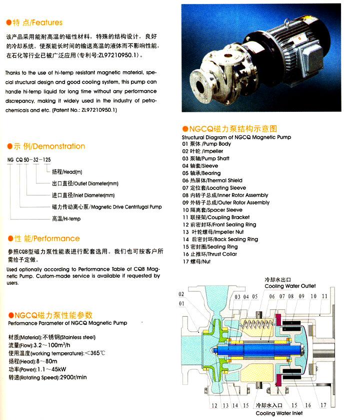 NGCQ型(耐高溫)≤450℃(水冷卻)磁力泵是采用內(nèi)外磁鋼推拉傳遞,磁路中間采用隔離套將液體封閉在隔離套內(nèi),以靜密封取代動(dòng)密封,使泵的過流部件處于密封狀態(tài),解決了其它泵的機(jī)械密封無法避免的跑、冒、滴之弊病。磁力泵選用耐腐蝕、高強(qiáng)度的工程塑料、鋼玉陶瓷、不銹鋼作為制造材料,因此具有良好的抗腐蝕性能,并可使被輸送介質(zhì)免受染。